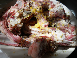 Tranșează cotletele de oaie și spală-le cu apă rece. Asezonează-le cu sarea grunjoasă, zeama și coaja de lămâie, boabele de coriandru sfărâmate, boiaua iute, țuica, pudra de chimen și 2 lingurițe de rozmarin uscat. Lasă-le la marinat pentru 30 de minute la frigider, acoperite cu folie de plastic.
